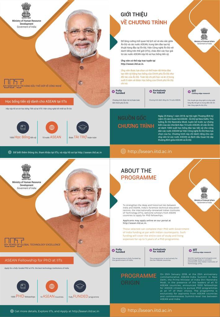 In recognition of the deep and historical ties between India and ASEAN, India's foremost technical education centers, the internationally renowned Indian Institutes of Technology (IITs), welcome aspirants from ASEAN countries to apply for PhD fellowships. Applicants apply online on this portal. Those selected get a chance to finish their PhD with funding at par with their Indian counterparts from the Government of India. The funding covers the entire cost of study and living expenses for up to 5 years of their PhD programme. For more details please login http://asean-iitd.in/