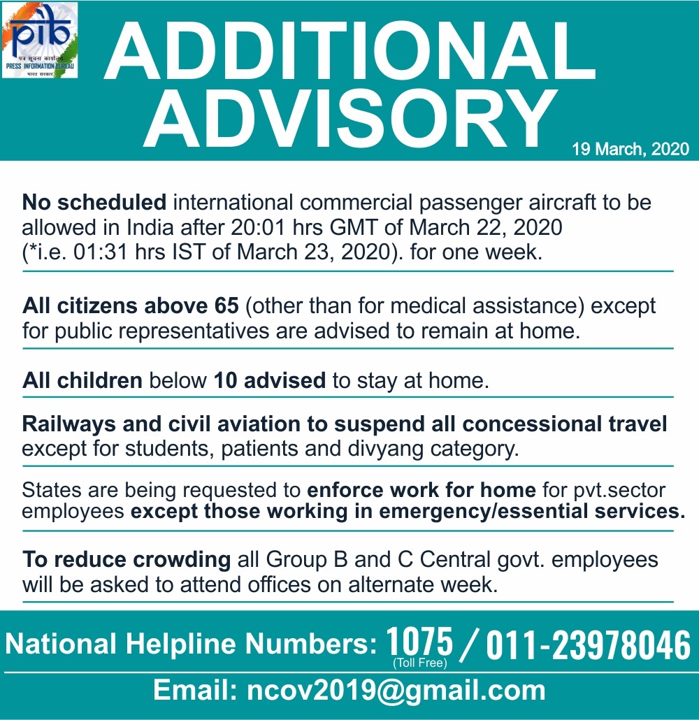 Latest COVID-19 Advisory by Government of India-19 March, 2020