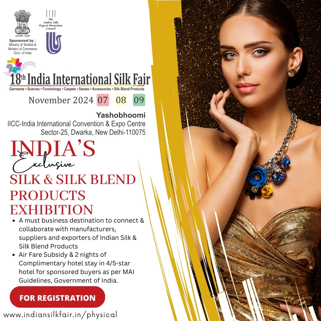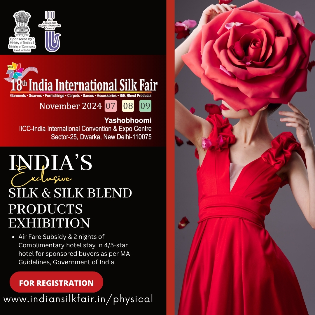 This is to inform that Indian Silk Export Promotion Council (ISEPC), India is organizing ‘18th India International Silk Fair’ from 07 to 09 November 2024 at Yashobhoomi, Dwarka, New Delhi, India.