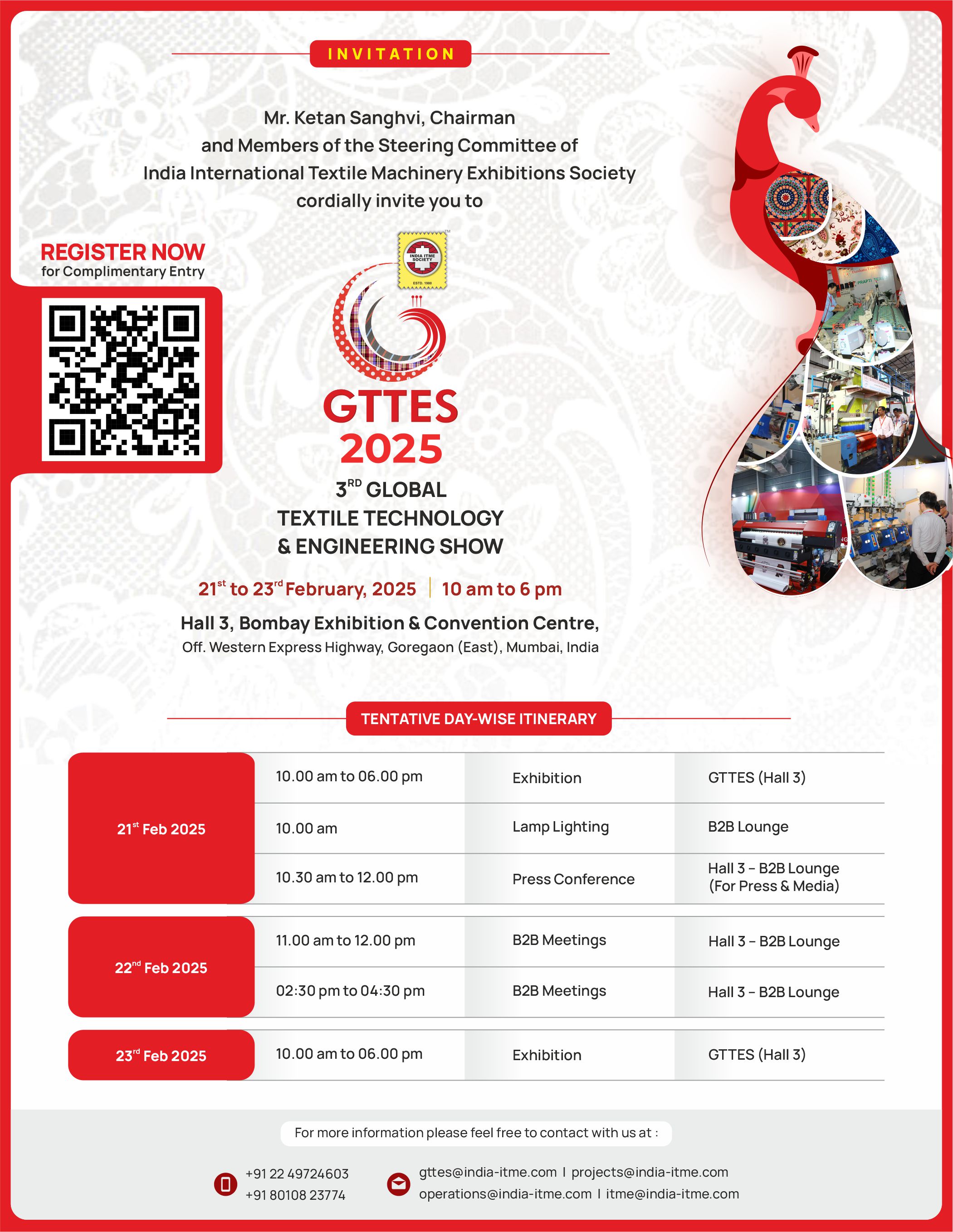 This is to inform that the ‘India International Textile Machinery Exhibitions Society’ is organizing the ‘3rd edition of Global Textile Technology Engineering Show (GTTES 2025)’ during 21-23 February 2025 at Bombay Exhibition & Convention Centre, Mumbai, India.