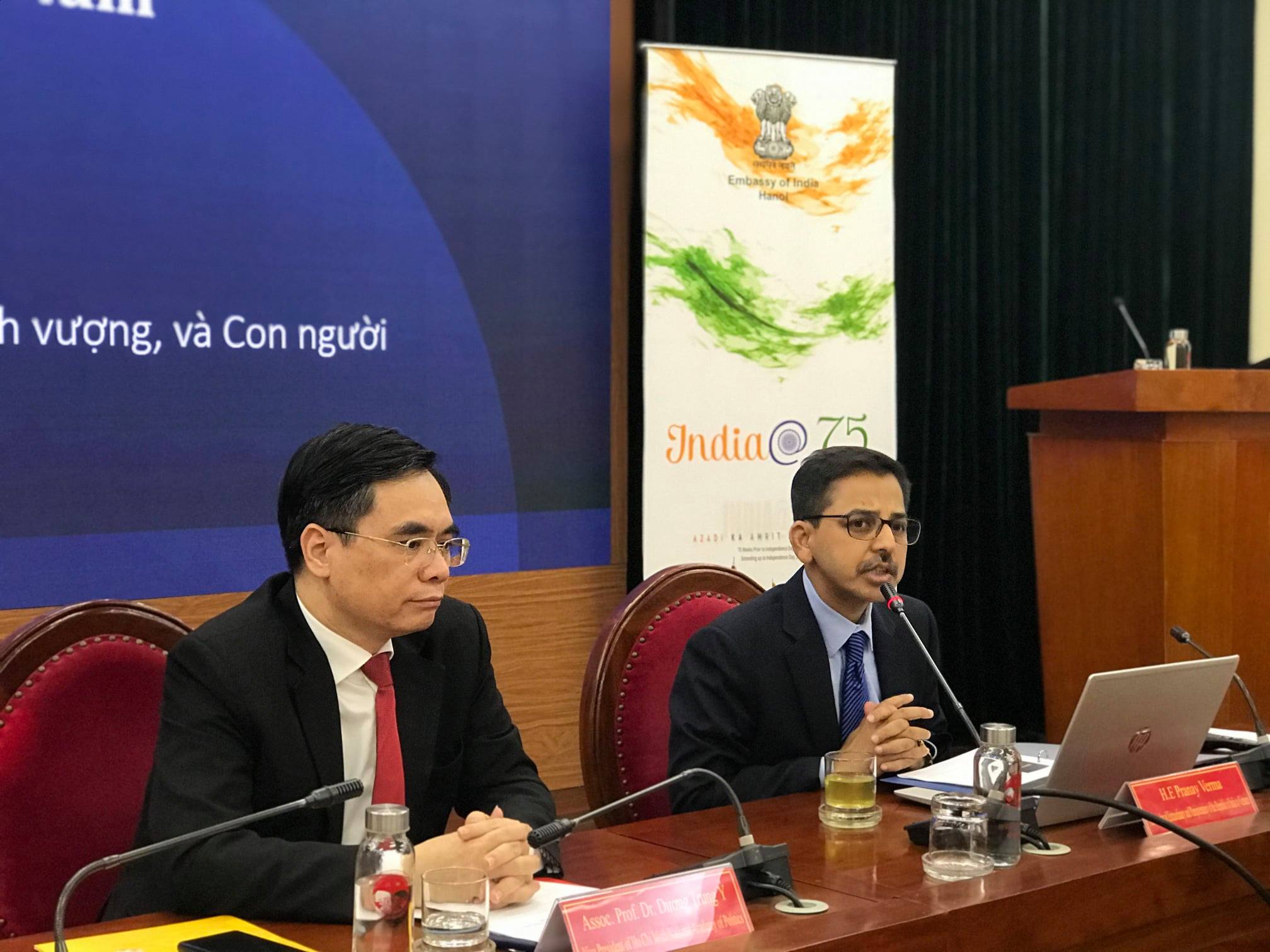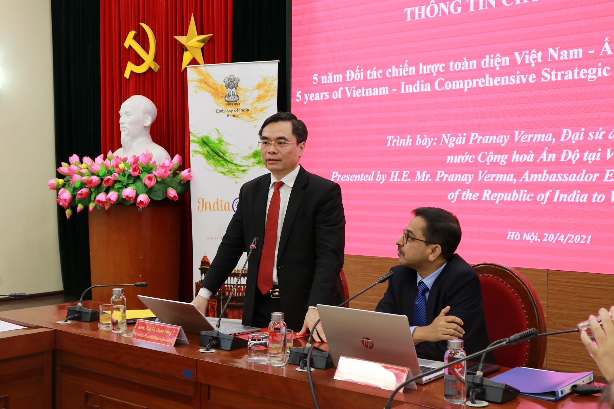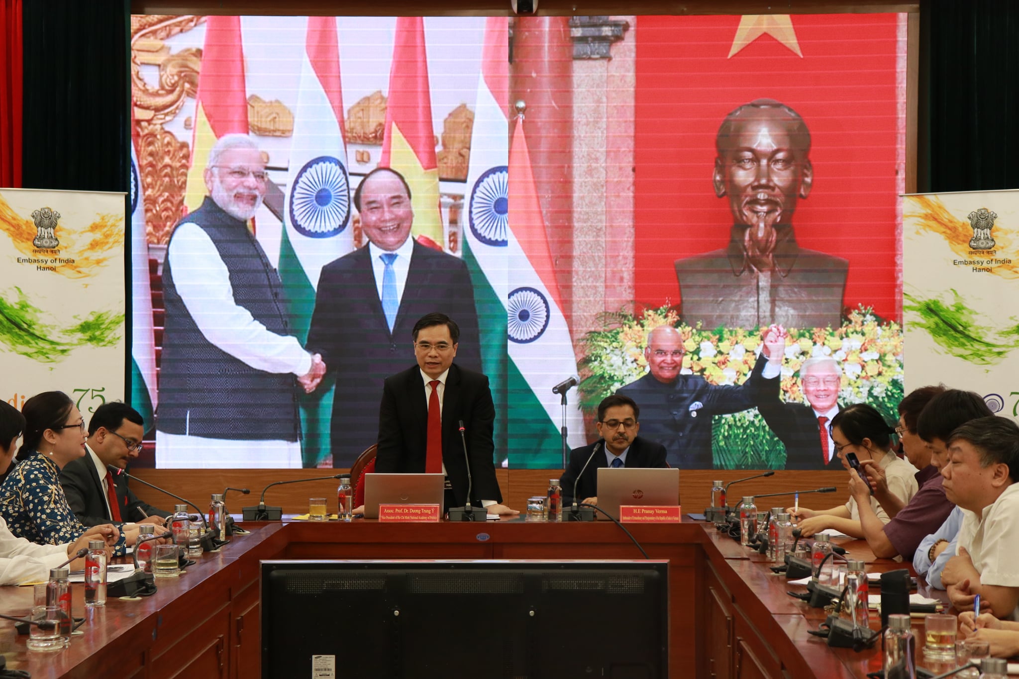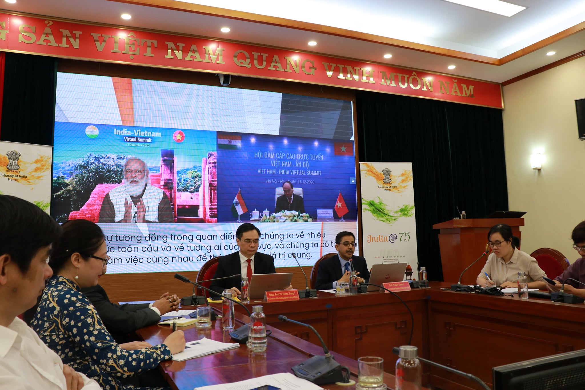 Continuing with Embassy's outreach to mark the 75 years of India's Independence, Ambassador Pranay Verma made a presentation on the Five Years of India-Vietnam Comprehensive Strategic Partnership at the Ho Chi Minh National Academy of Politics - Vietnam's premier institution for training of senior Party and State officials - on 20 April 2021. Vice President of HCMNAP, Associate Prof. Dr. Duong Trung Y, along with senior scholars, researchers and officials from the Academy and other leading thinktanks of Vietnam participated. Ambassador presented the multifaceted developments in India-Vietnam relations since their elevation to the level of Comprehensive Strategic Partnership during the visit of Prime Minister Shri Narendra Modi to Vietnam in 2016. Ambassador also underlined the bright prospects for the future of this long-standing partnership guided by the Joint Vision for Peace, Prosperity and People adopted by the Prime Ministers of the two countries during their recent Virtual Summit and driven by the growing capabilities of both India and Vietnam.