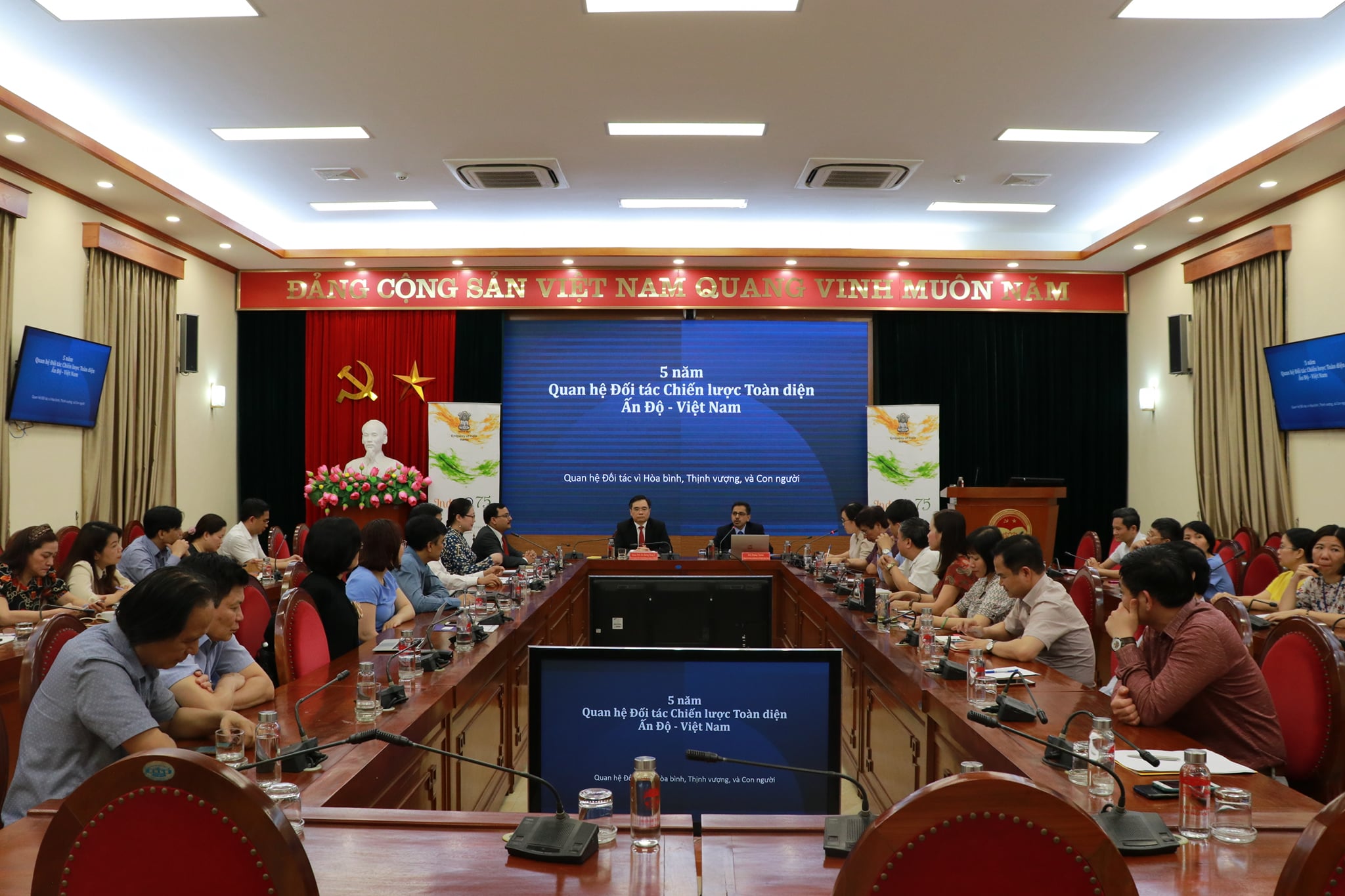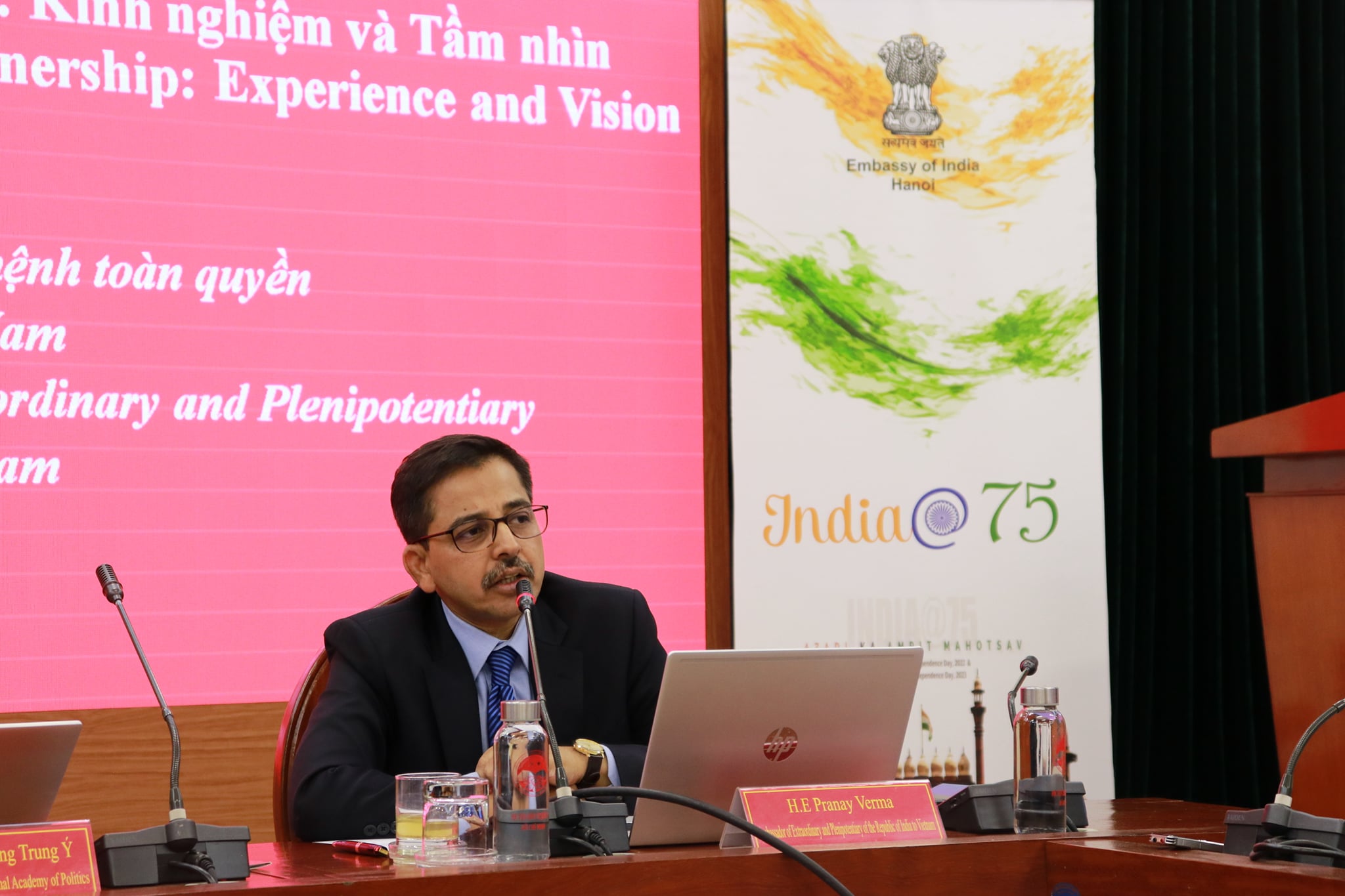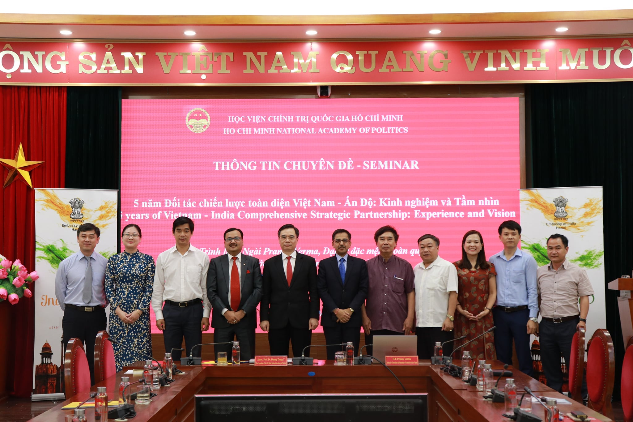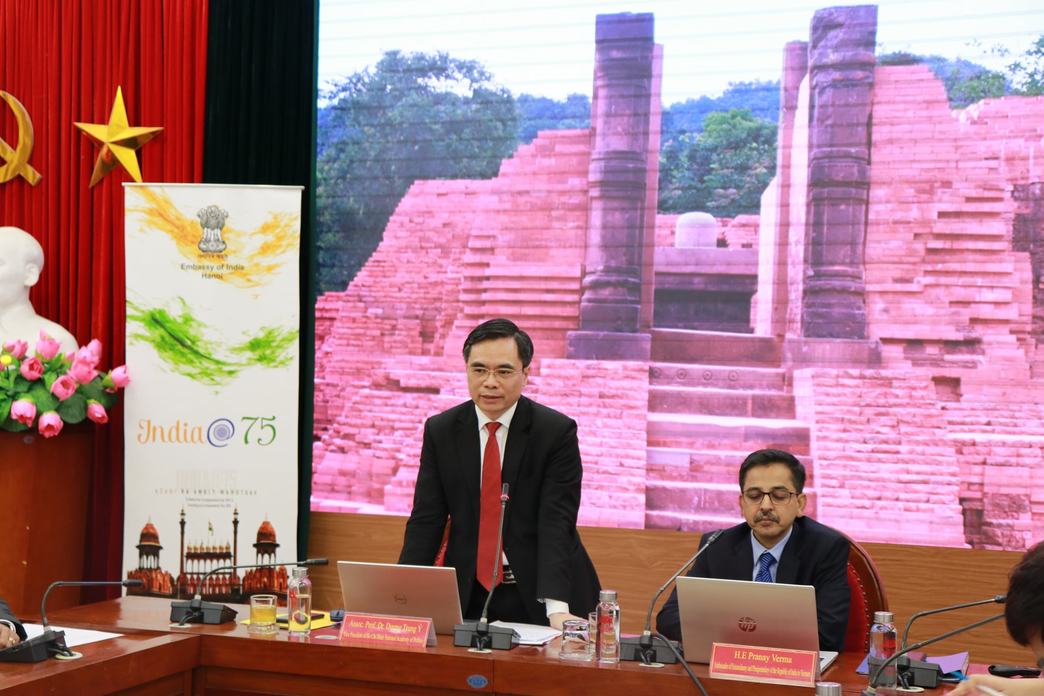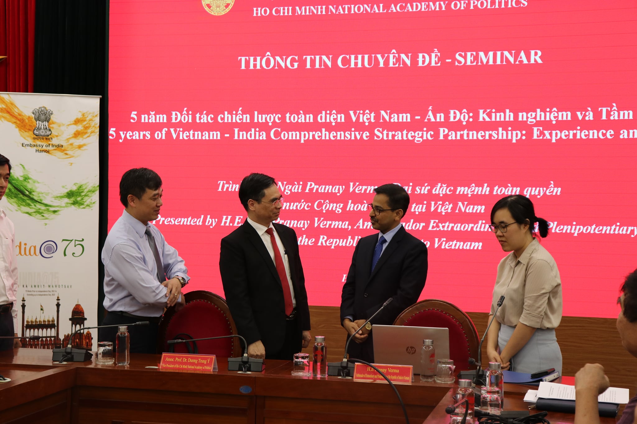 Continuing with Embassy's outreach to mark the 75 years of India's Independence, Ambassador Pranay Verma made a presentation on the Five Years of India-Vietnam Comprehensive Strategic Partnership at the Ho Chi Minh National Academy of Politics - Vietnam's premier institution for training of senior Party and State officials - on 20 April 2021. Vice President of HCMNAP, Associate Prof. Dr. Duong Trung Y, along with senior scholars, researchers and officials from the Academy and other leading thinktanks of Vietnam participated. Ambassador presented the multifaceted developments in India-Vietnam relations since their elevation to the level of Comprehensive Strategic Partnership during the visit of Prime Minister Shri Narendra Modi to Vietnam in 2016. Ambassador also underlined the bright prospects for the future of this long-standing partnership guided by the Joint Vision for Peace, Prosperity and People adopted by the Prime Ministers of the two countries during their recent Virtual Summit and driven by the growing capabilities of both India and Vietnam.
