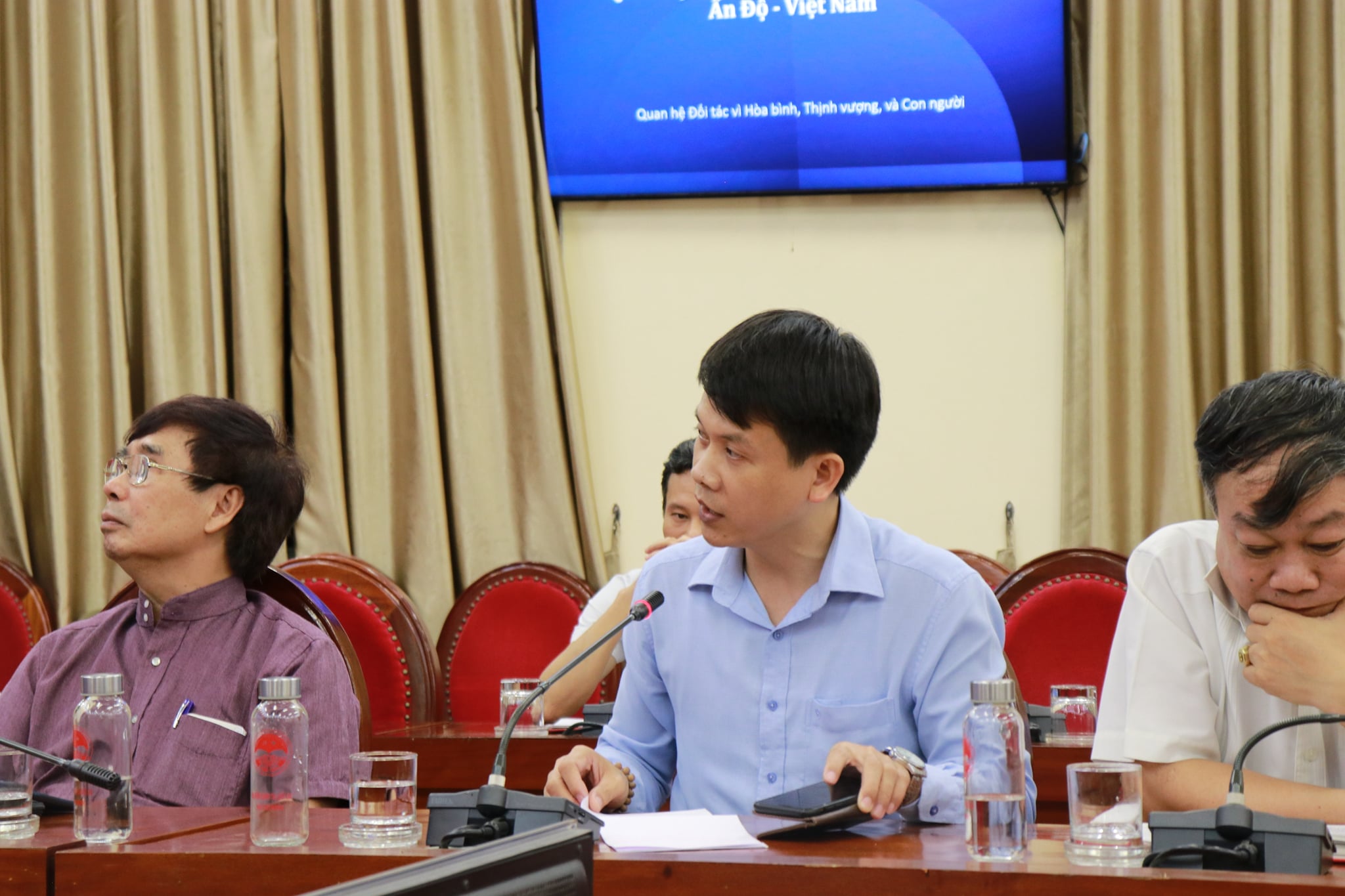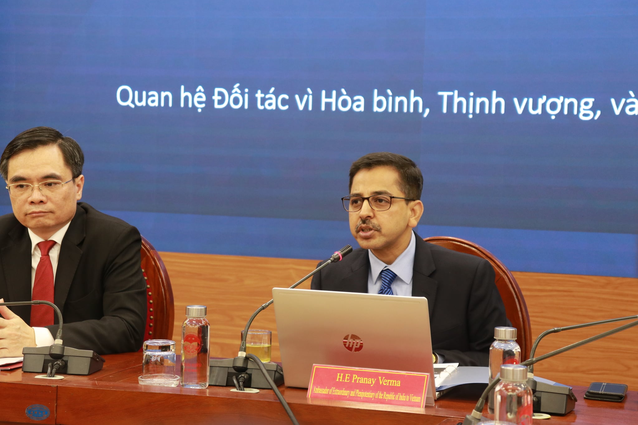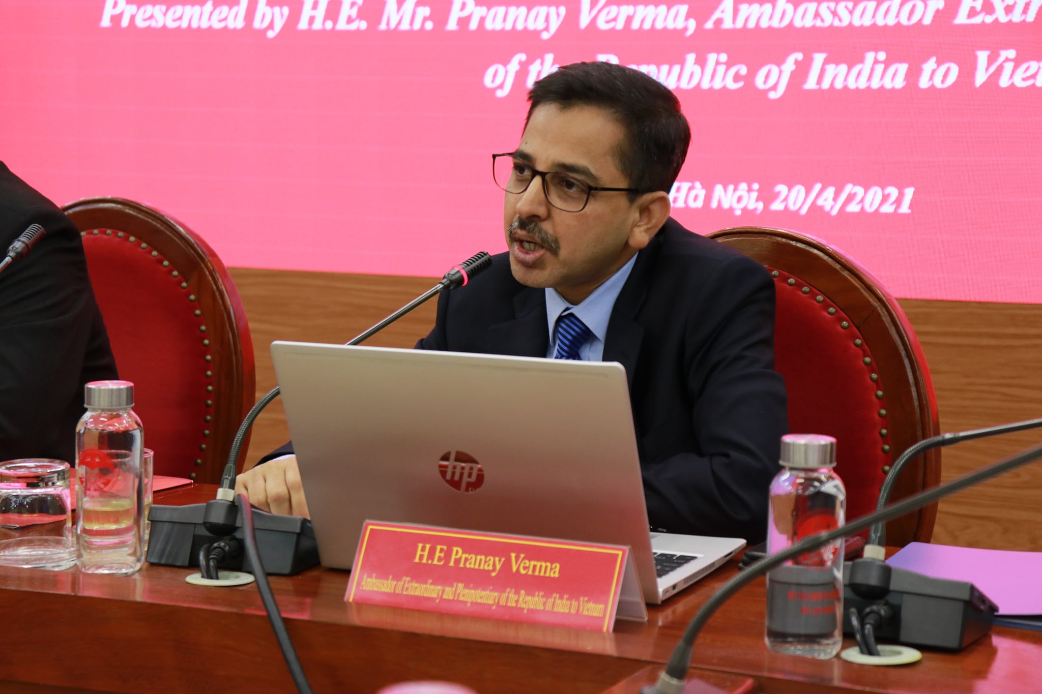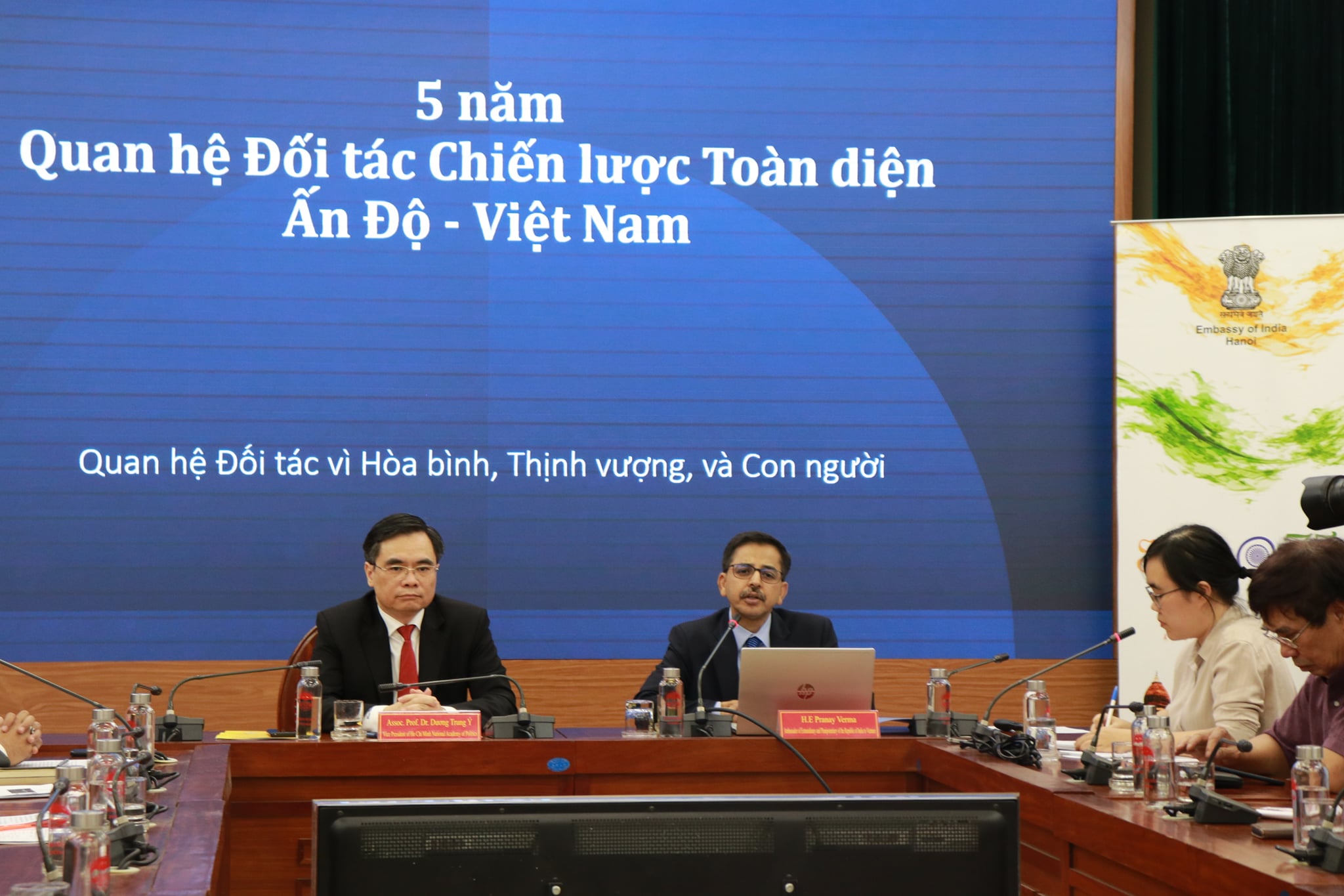 Continuing with Embassy's outreach to mark the 75 years of India's Independence, Ambassador Pranay Verma made a presentation on the Five Years of India-Vietnam Comprehensive Strategic Partnership at the Ho Chi Minh National Academy of Politics - Vietnam's premier institution for training of senior Party and State officials - on 20 April 2021. Vice President of HCMNAP, Associate Prof. Dr. Duong Trung Y, along with senior scholars, researchers and officials from the Academy and other leading thinktanks of Vietnam participated. Ambassador presented the multifaceted developments in India-Vietnam relations since their elevation to the level of Comprehensive Strategic Partnership during the visit of Prime Minister Shri Narendra Modi to Vietnam in 2016. Ambassador also underlined the bright prospects for the future of this long-standing partnership guided by the Joint Vision for Peace, Prosperity and People adopted by the Prime Ministers of the two countries during their recent Virtual Summit and driven by the growing capabilities of both India and Vietnam.