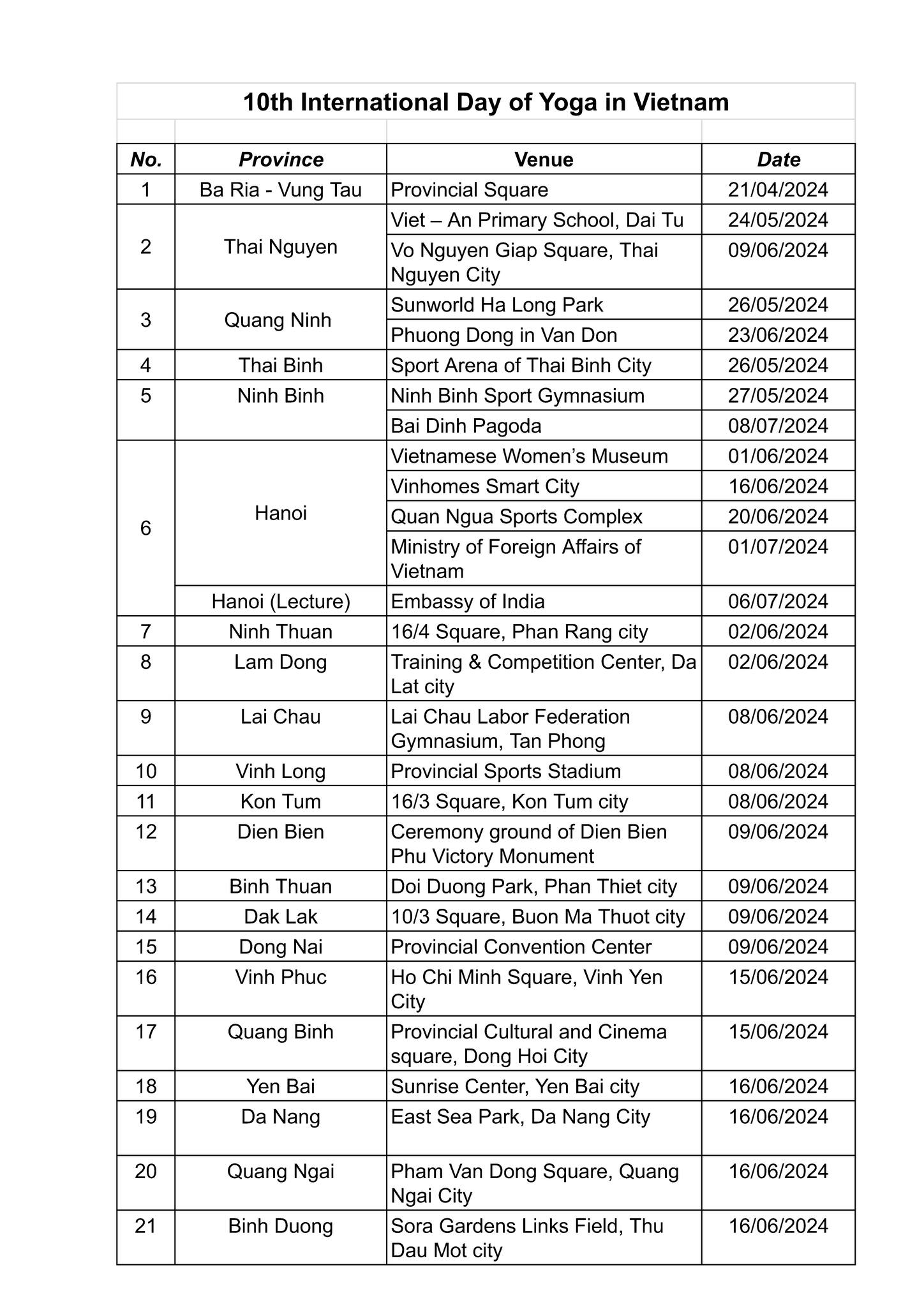 The 10th International Day of Yoga - 2024 was observed with yoga performances in over 45 provinces/ cities in collaboration between Vietnamese authorities and Indian Embassy/Consulate General under the theme "Yoga for Self and Society". We appreciate the large and growing interest in practice of Yoga for healthy living among the friendly people of Vietnam and kind support of authorities, Yoga Federation and Yoga clubs.