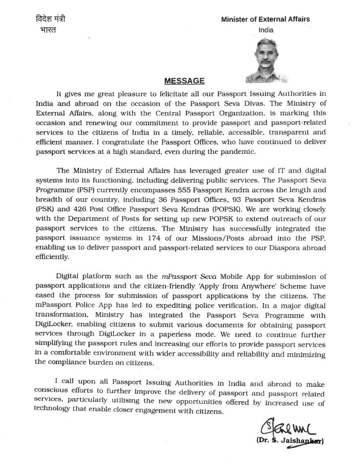Message from Hon'ble External Affairs Minister of India Shri Subrahmanyam Jaishankar on the occasion of Passport Seva Divas.