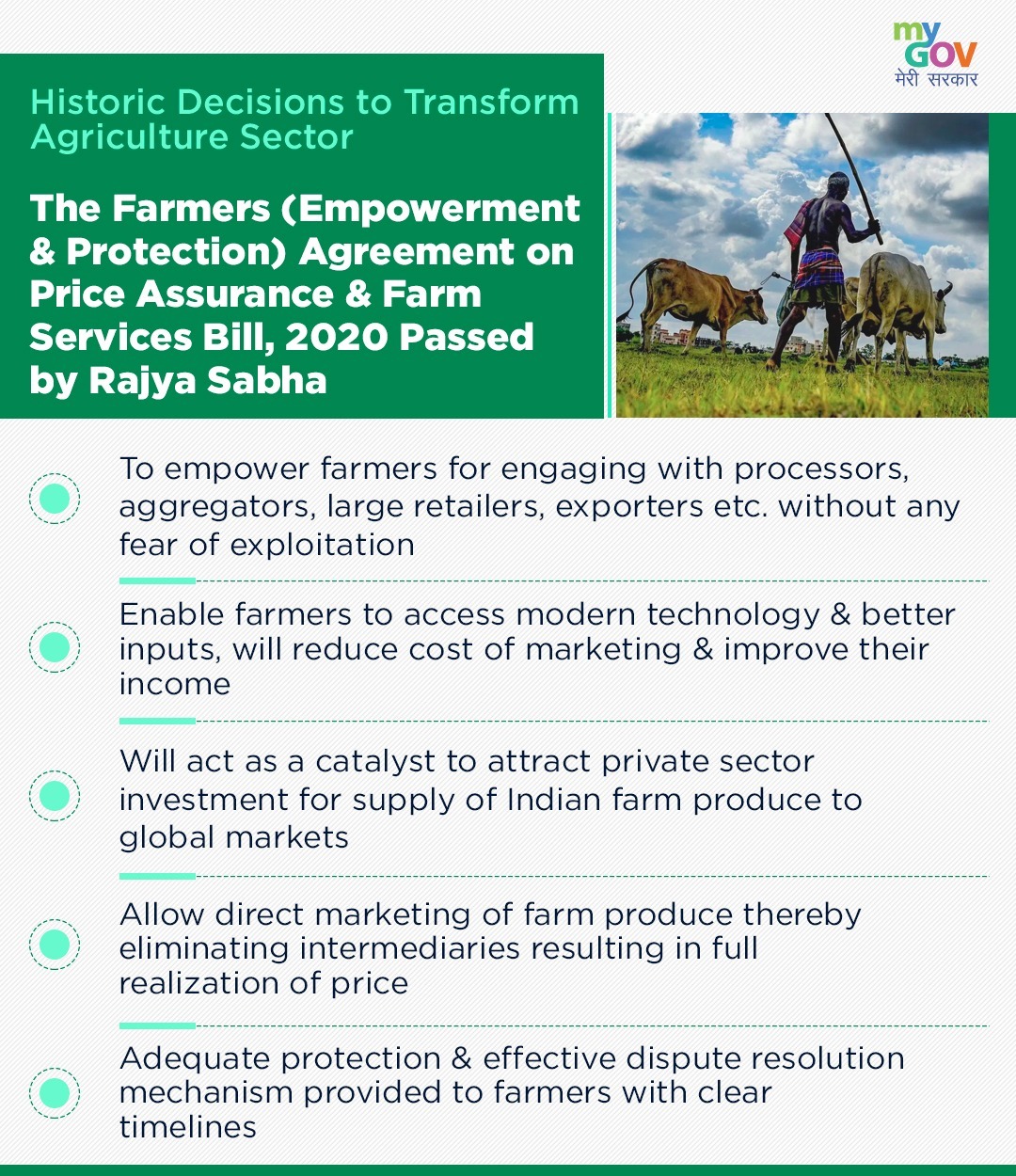 - The new legislation will empower farmers for engaging with processors, wholesalers, aggregators, wholesalers, large retailers, exporters etc., on a level playing field. Price assurance to farmers even before sowing of crops. In case of higher market price, farmers will be entitled to this price over and above the minimum price.