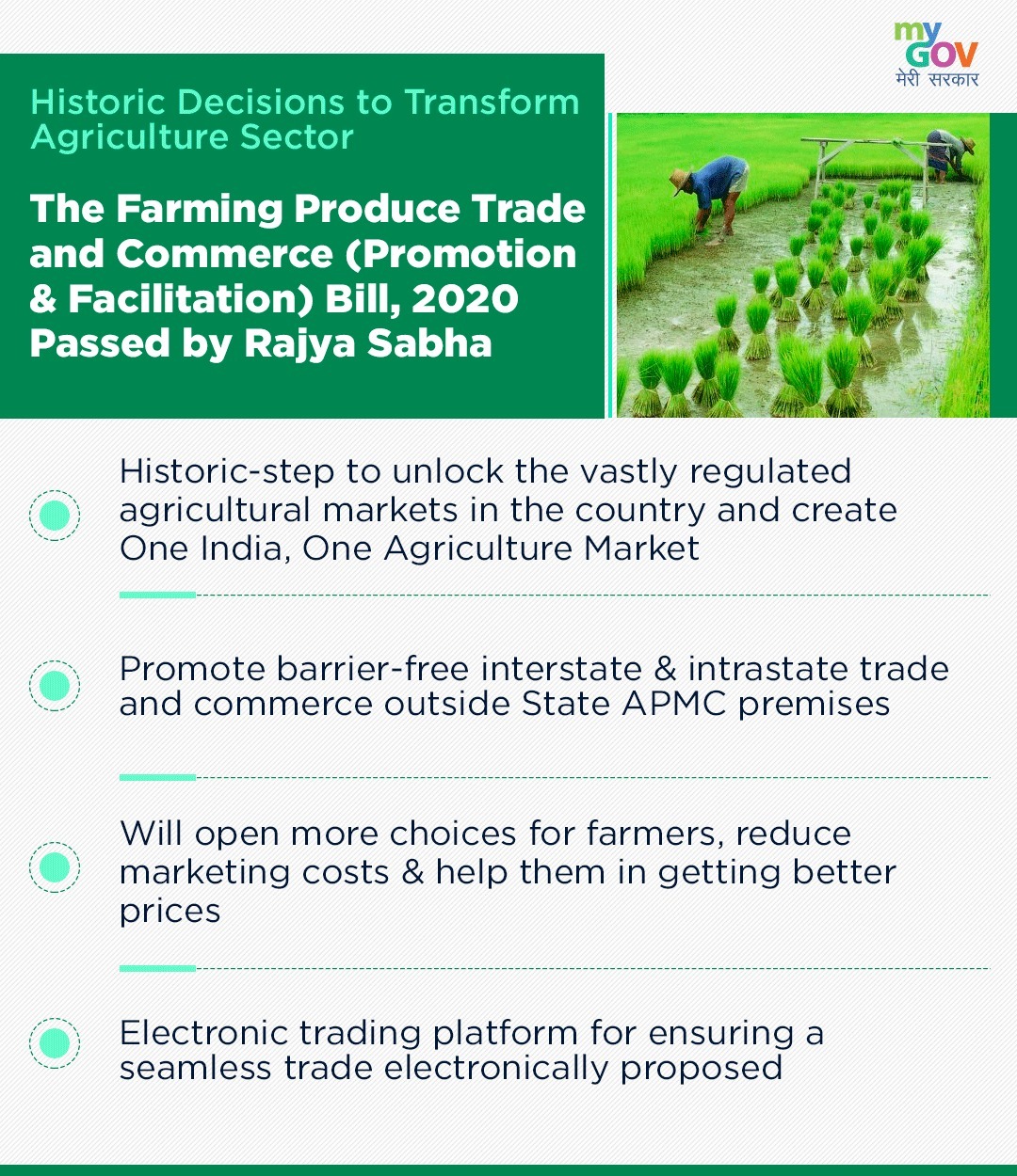 Parliament today passed two bills aimed at transforming agriculture in the country and raising farmers’ incomes. The Farmers' Produce Trade and Commerce (Promotion and Facilitation) Bill, 2020 and The Farmers (Empowerment and Protection) Agreement of Price Assurance and Farm Services Bill, 2020 which were passed by Lok Sabha on 17th September 2020, were passed by the Rajya Sabha also today. The Bills were introduced in Lok Sabha on 14th September 2020 by Union Minister of Agriculture & Farmers’ Welfare, Rural Development & Panchayati Raj, Shri Narendra Singh Tomar, to replace ordinances promulgated on 5th June 2020.