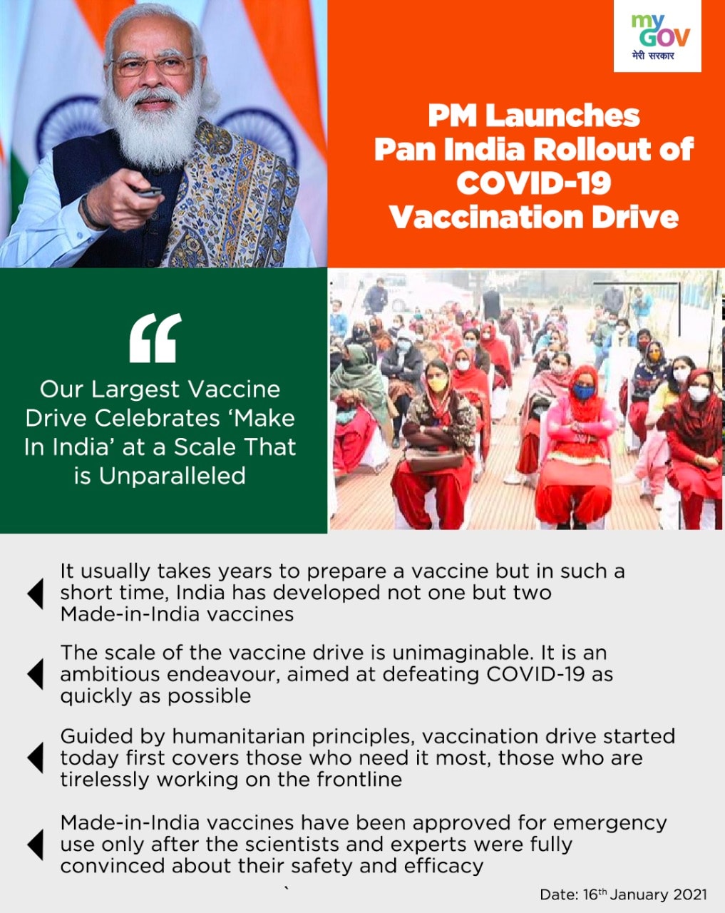 After the speech Prime Minister tweeted “India begins the world’s #LargestVaccineDrive. This is a day of pride, a celebration of the prowess of our scientists and hardwork of our medical fraternity, nursing staff, police personnel and sanitation workers.