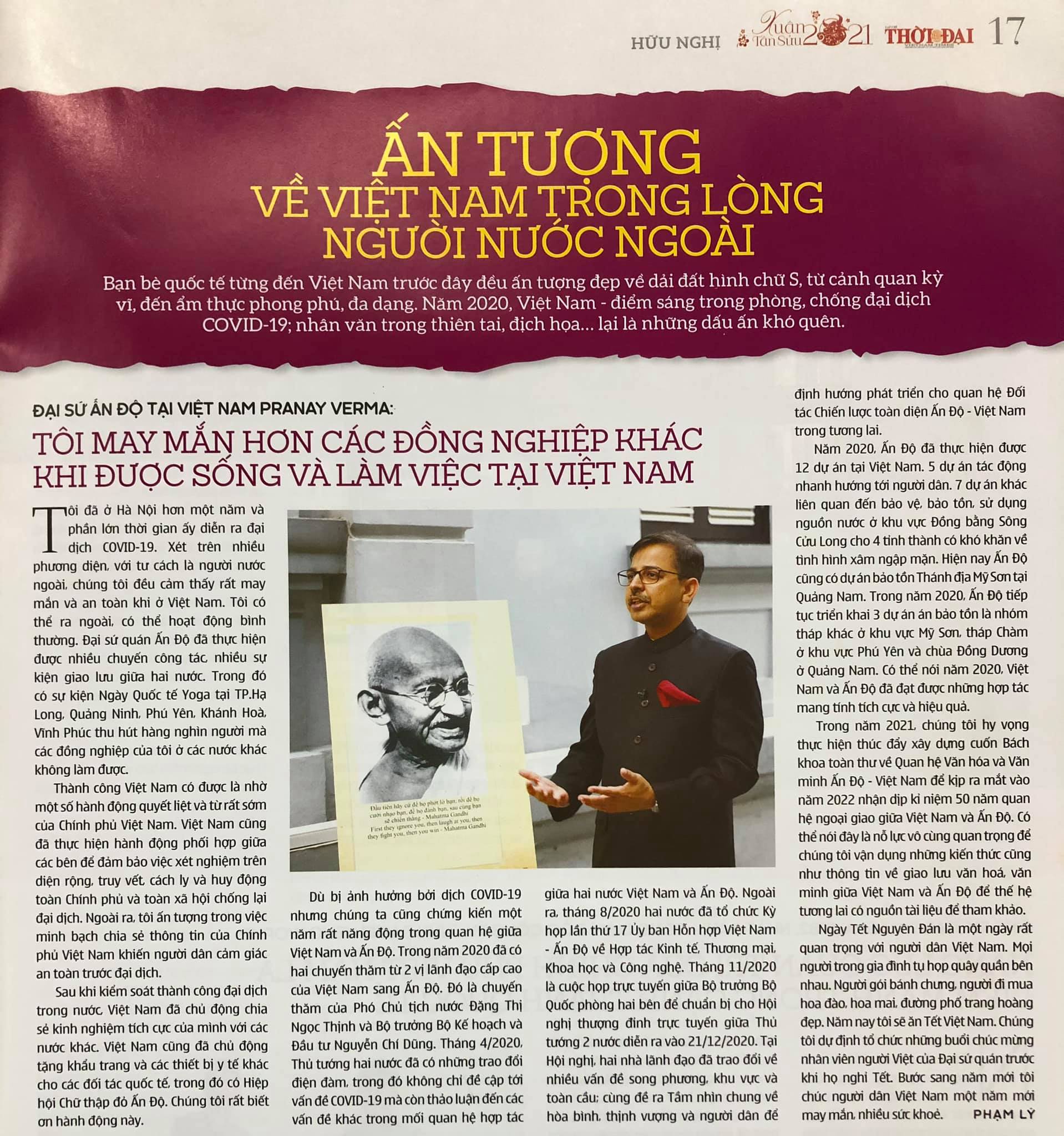 Ambassador Pranay Verma spoke to Vietnam Times summarizing the achievements of India-Vietnam Comprehensive Strategic Partnership in 2020 and looking forward to a year filled with hope and positivity.